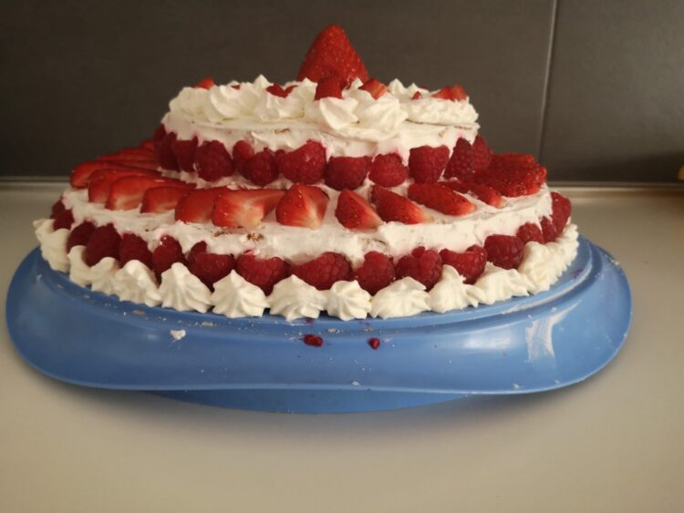 Quando la base della torta è completamente fredda tagliare a metà e farcire con la crema, coprire con il disco superiore e preparare la panna per la copertura esterna. In una ciotola montare la panna con le fruste elettriche, coprire la torta e decorare con fragole e lamponi secondo la vostra fantasia.