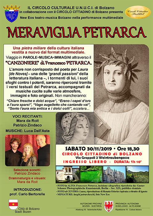 L’appuntamento è per sabato 30 novembre 2019 al Circolo Cittadino di Via Grappoli 2 a Bolzano, dove con inizio alle ore 18.30 e ingresso libero è in programma la “prima” della nuova proposta di New Eos teatro-musica Bolzano, compagine artistica specializzatasi nella multimedialità applicata alla cultura, alla cronaca, alla conoscenza.