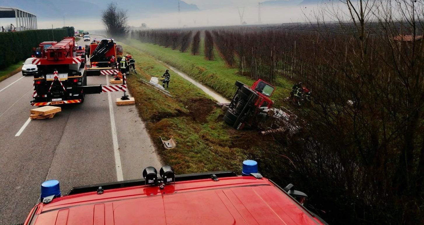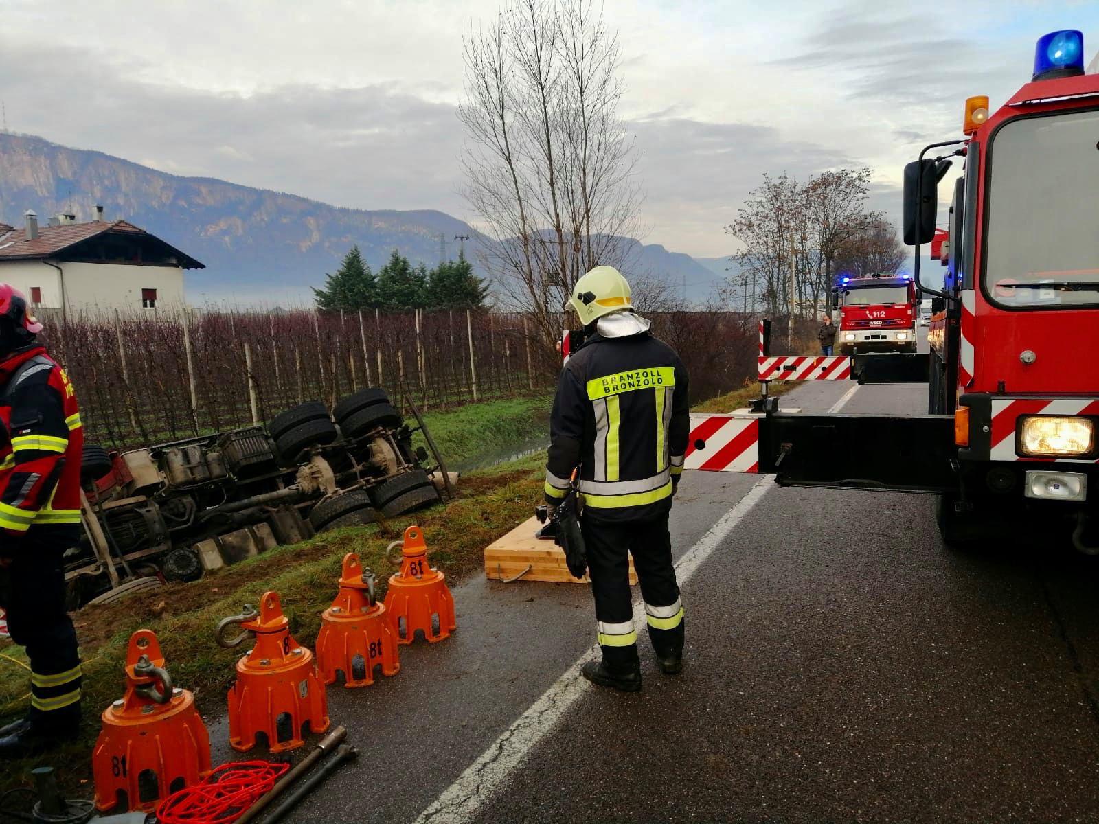 Incidente questa mattina intorno alle 8 sulla retta per Bronzolo, all’altezza della Südtirol Fenster, dove un mezzo pesante, per cause ancora in corso di verifica, è uscito di strada rovesciandosi al lato della carreggiata.