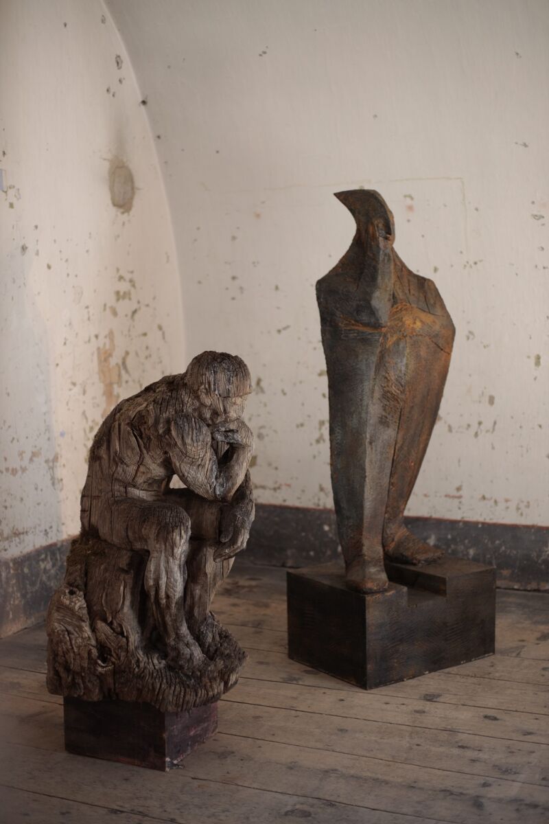Processi consapevoli di cambiamento, esperimenti, anni di tentativi e molte esperienze hanno formato, ad esempio, il linguaggio formale unico di Wilhelm Senoner (Ortisei). Le superfici delle sue sculture sono ruvide come una roccia aspra, gli spigoli e le linee come pietre tagliate di netto, i colori sembrano paesaggi trasferiti dalla natura, cercando le giuste composizioni cromatiche a seconda della stagione. Nella mostra al Forte espone le sculture in legnoPensatore ispirato ad Auguste Rodin” (1968) e “Pensatore” (2018).