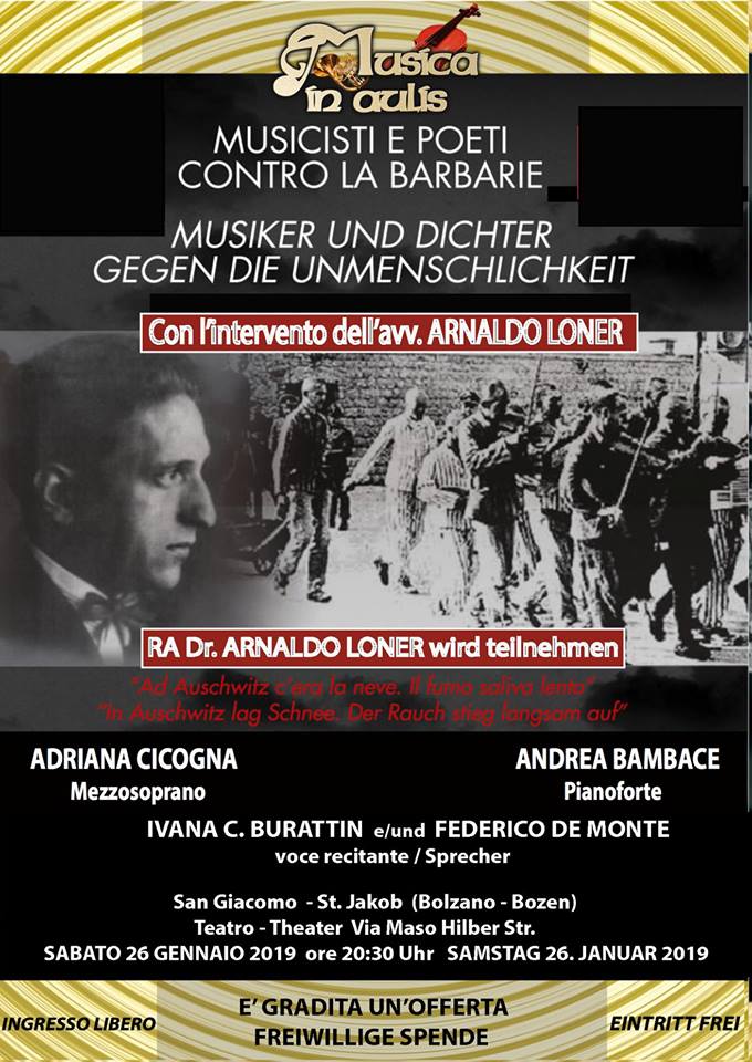 Un appuntamento musicale che sarà un vero e proprio evento anche per la partecipazione dell’avv. Arnaldo Loner, che fu, a suo tempo, patrocinatore della causa civile per conto del Comune di Bolzano contro il “boia” del lager di Bolzano, Misha Seifert.