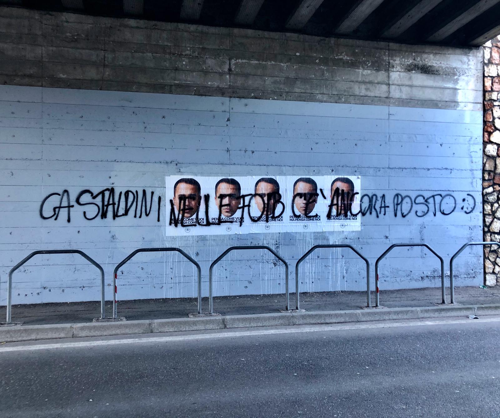 Sotto, la scritta apparsa sul muro di un sottopasso di Trento
