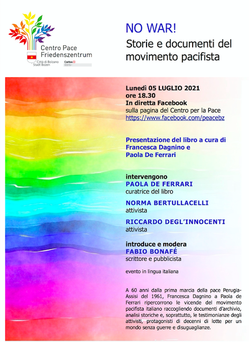 Il Centro per la Pace del Comune di Bolzano, sotto la gestione della Caritas Diocesi Bolzano-Bressanone, invita alla presentazione del libro prevista per lunedì 5 luglio, ore 18:30 in diretta Facebook sulla pagina del Centro per la Pace https://www.facebook.com/peacebz