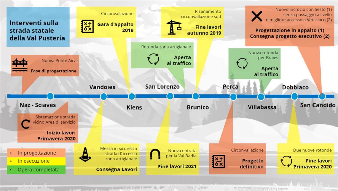 Sono state completate due nuove rotatorie, quella nei pressi dello svincolo per la val di Braies e quella nei pressi della zona artigianale fra Brunico e S. Lorenzo di Sebato, che possono convogliare meglio i flussi di traffico. Altre due nuove rotatorie a Dobbiaco, attualmente in fase di costruzione, dovrebbero essere pronte entro il 2020 e andare a sostituire due snodi rendendo più fluido il transito. La circonvallazione sud di Brunico è in fase di risanamento: per settembre dovrebbe essere rinnovato l’asfalto affinché la strada sia più sicura in caso di pioggia.
