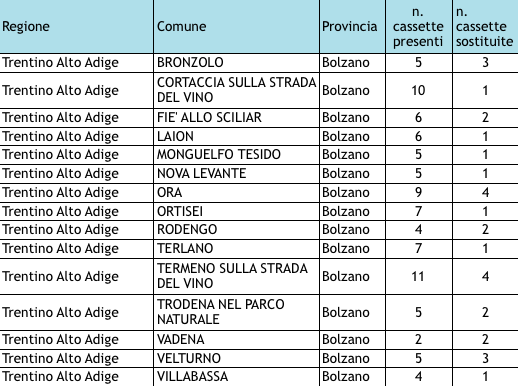 Le nuove installazioni sono state effettuate nei 15 comuni di Bronzolo, Cortaccia, Fié allo Sciliar, Laion, Monguelfo Tesido, Nova Levante, Ora, Ortisei, Rodengo, Terlano, Termeno, Trodena, Vadena, Velturno e Villabassa, e coinvolgeranno presto altre realtà del territorio provinciale.