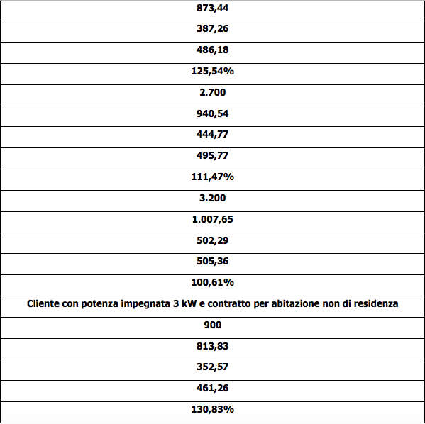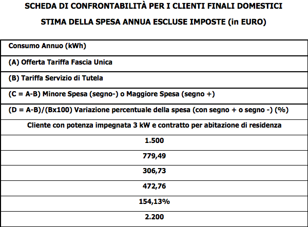 Come è facile vedere dalla scheda riportata, la differenza fra l’offerta proposta dal fornitore e la tariffa del servizio di tutela è a tutto svantaggio economico del cliente, con differenze di prezzo che variano addirittura fra il +63,02% e +154,13%.! Un’enormità. Nemmeno la promessa di una “superiore qualità del servizio prestato” potrebbe giustificare simili differenze di prezzo.