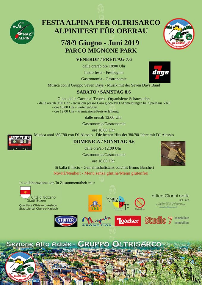 Aprirà ufficialmente questo venerdì 7 giugno alle 18, presso il Parco Mignone, la tre giorni di festa organizzata dal Gruppo Alpini Oltrisarco, in collaborazione con la Circoscrizione del quartiere e con il patrocinio del Comune di Bolzano.