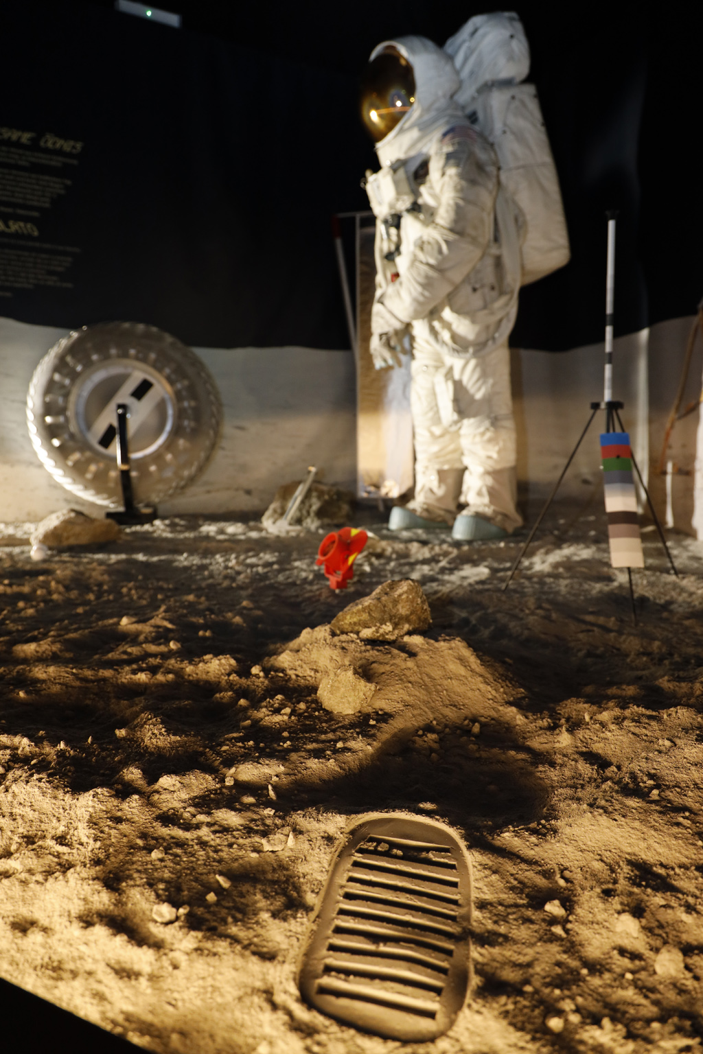 Lo accoglie infatti un’accurata ricostruzione dell’ambiente dell’allunaggio, con tanto di tuta spaziale realizzata dalla stessa ditta che la costruì allora, sabbia di basalto, rocce e impronte, e la riproduzione di una ruota di un veicolo che camminò sulla Luna.
