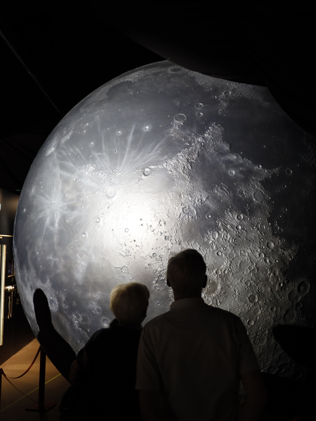 Non mancano la vela in alluminio usata dagli astronauti dell’Apollo per captare le particelle solari, la bandierina statunitense piantata da Armstrong (riproduzioni), ormai sbiadita dalle radiazioni, e cibo spaziale della missione, questo in originale. Al centro della mostra troneggia un gigantesco modello della Luna di quasi quattro metri di diametro, con mari e crateri perfettamente definiti.