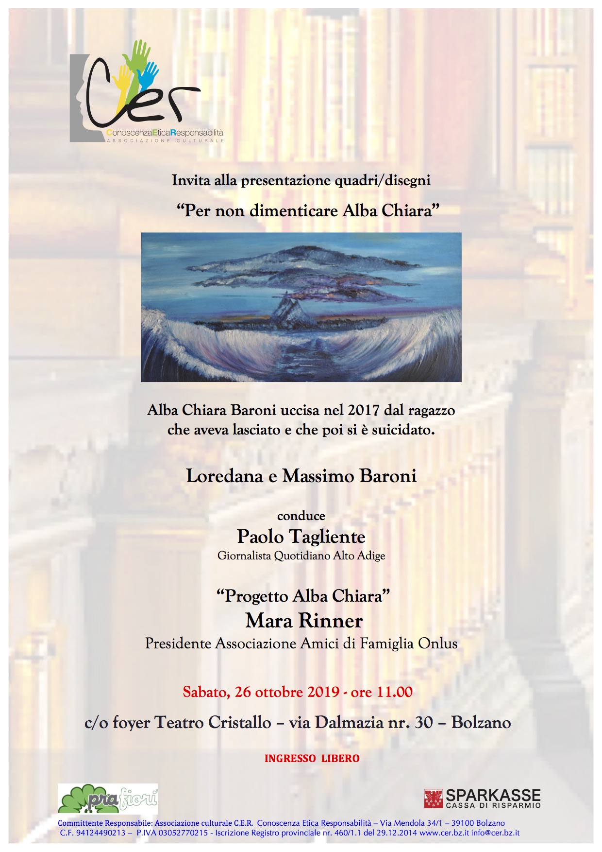 Una mostra dal titolo “Per non dimenticare Alba Chiara” la farà rivivere ancora una volta. L’appuntamento è a Bolzano sabato 26 ottobre alle 11 presso il foyer del Teatro Cristallo di via Dalmazia nr. 30.