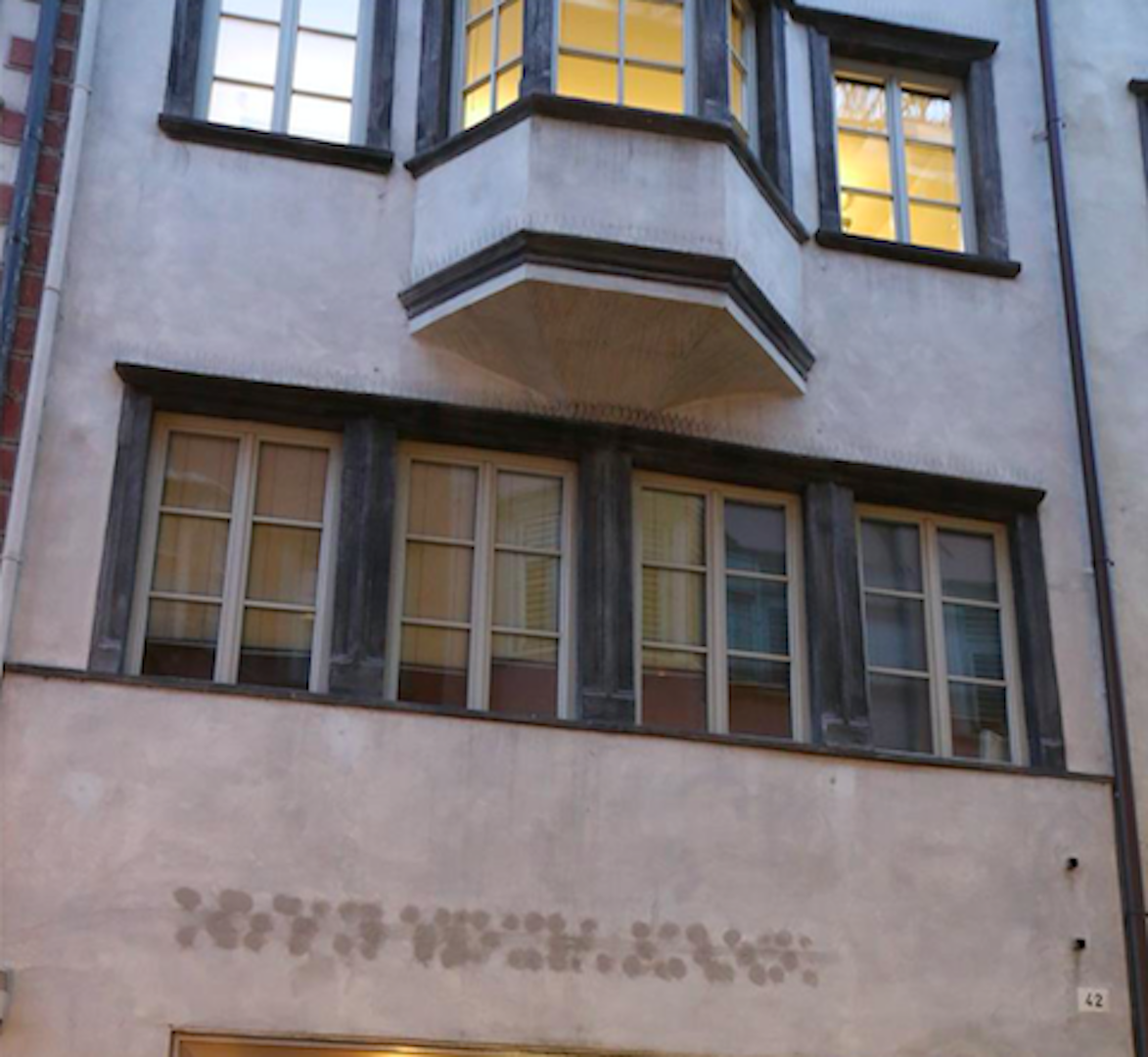 L’edificio è il risultato dell’unione di due case inizialmente separate. La casa risultante, oggi al civico 40 di via Goethe – già “Schlüsselwirt” – è sottoposta a vincolo architettonico per i suoi affreschi tardogotici, i suoi soffitti con travi a vista e in generale per le sue caratteristiche costruttive.