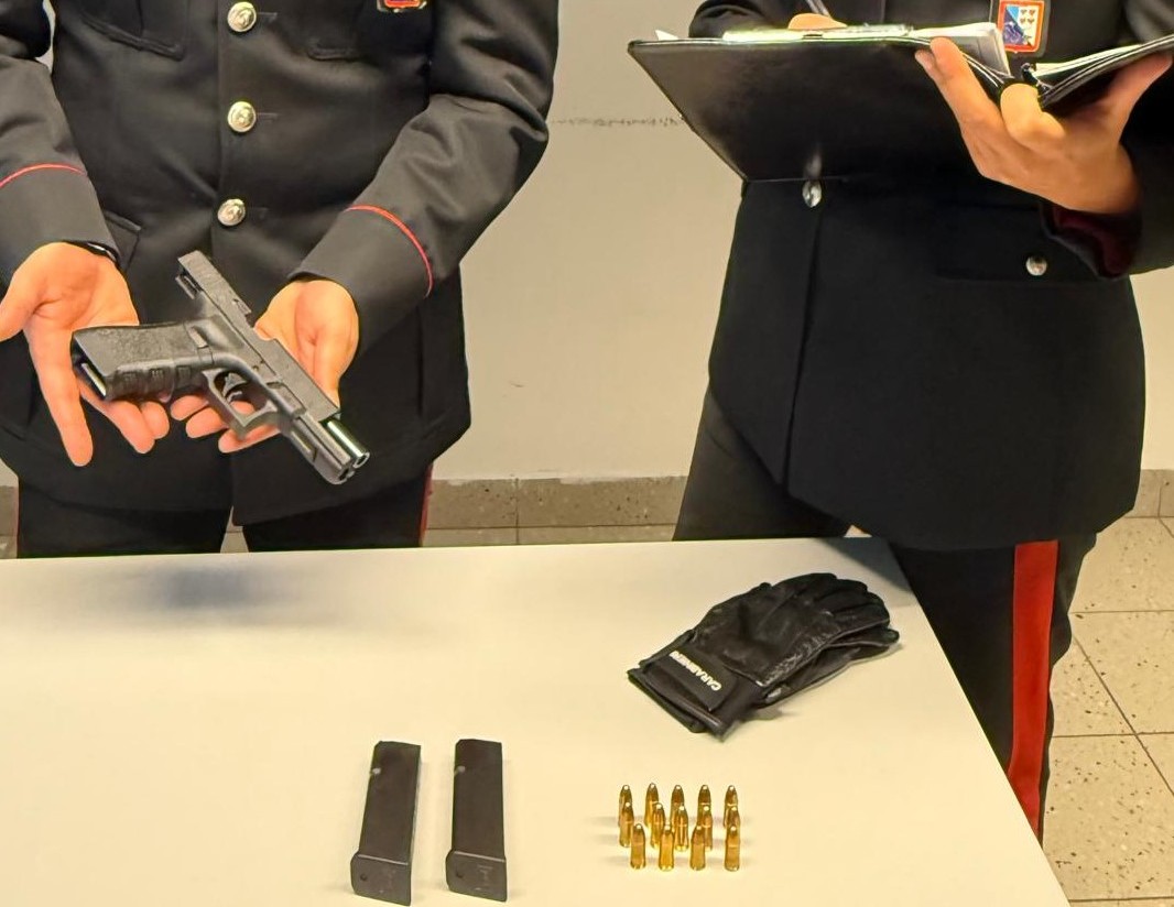 I Carabinieri hanno proceduto al sequestro della pistola e di 14 proiettili calibro 9×19 rinvenuti durante una successiva perquisizione domiciliare.