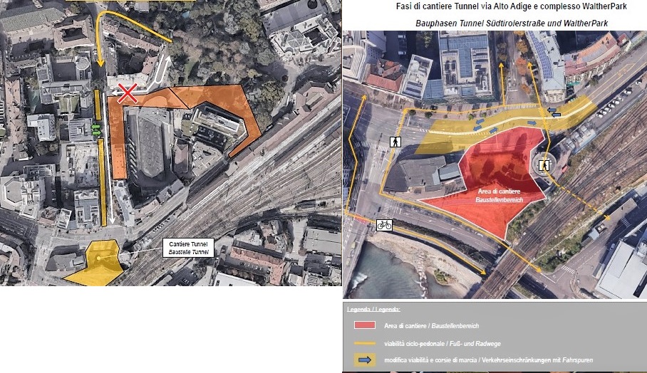Le cosiddette “macro fasi” successive dei lavori, prevedono per quanto riguarda il cantiere del tunnel di via Alto Adige, la chiusura del tratto compreso tra piazza Verdi e l’ingresso del garage CityCenter nel periodo giugno 2021-gennaio 2022 con contestuale riapertura di via Perathoner verso viale Stazione (fase 3); la chiusura del tratto dall’ ingresso al garage City Center fino all’incrocio con via Perathoner nel periodo successivo ossia da gennaio 2022 a maggio 2022 (fase 4); infine la chiusura del tratto tra l’ incrocio via Alto Adige-via Perathoner fino a piazza Walther, tra giugno 2022 e marzo 2023 (fase 5).