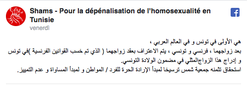 Lo stato tunisino ha riconosciuto per la prima volta un matrimonio tra due omosessuali. Ad annunciarlo tramite la propria pagina facebook è l’associazione ‘Shams‘ che lotta per la depenalizzazione dell’omosessualità nel Paese nordafricano.