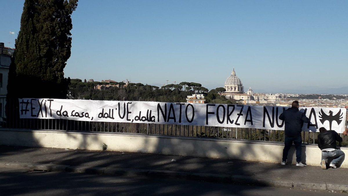 Blitz di Forza Nuova oggi (23 marzo) in centro a Roma, dove la bandiera europea è stata bruciata e uno striscione appeso con la scritta “#Exit da casa, dalla UE, dalla Nato“.