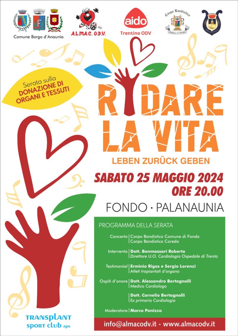 Sabato 25 maggio alle ore 20 presso il Palanaunia di Fondo si terrà l’evento di sensibilizzazione sulla donazione di organi “Ridare la vita”, volto a informare e coinvolgere la comunità su un tema di vitale importanza. Per l’occasione i corpi bandistici di Fondo e di Coredo si esibiranno in concerto, allietando la serata.