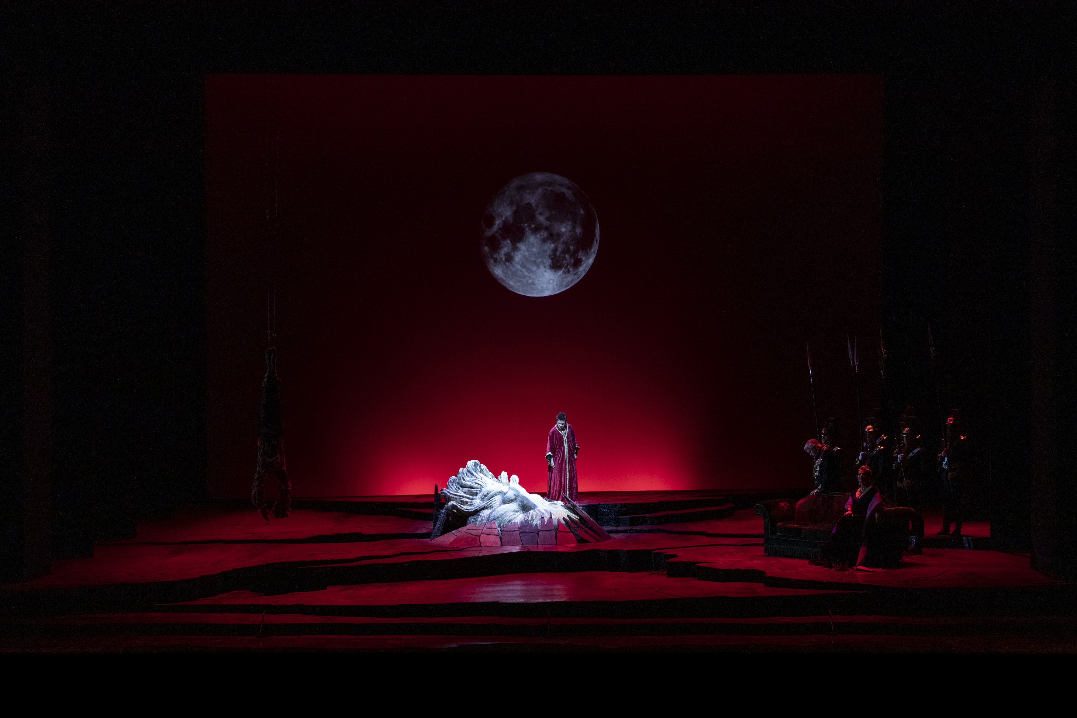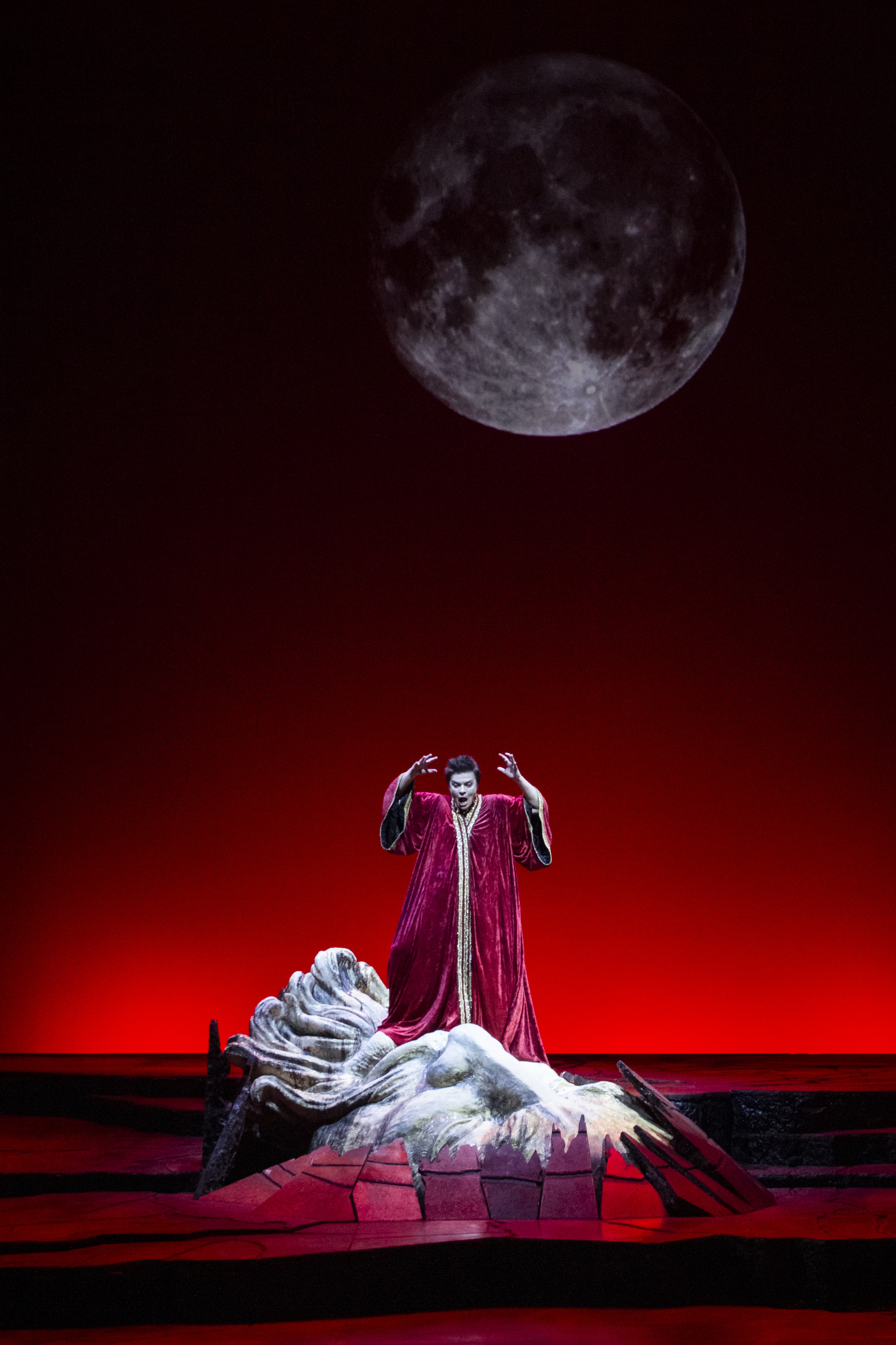 Perché solo così dev’essere l’arte: e più arte è, più è per tutti. Il teatro (e l’Opera, sua suprema espressione) non abbisogna di perfezione formale su tutti i suoi piani, non deve produrre quel dérèglement des senses per vista udito odorato eccetera per tutto il tempo dell’intrattenimento: basta un drappeggio scarlatto, una geniale presenza di sfondo fatta di colori, luna e armati di lancia, basta una meravigliosa Ausrine Stundyte (Salomè), così umana carnale e provocante, vera donna nella sua danza da non-tersicorea, mezza iena e mezza gattina, così (donna) fragile e tremenda, basta la sua indemoniata danza dei sette veli, basta il perfetto arrendersi di un uomo che è messo in contraddizione e si gode la sua tragica contraddizione (Erode, Ian Storey), basta una moglie e madre (Erodiade, Doris Soffel) che resiste e resiste, rendendosi perfettamente intelligibile, fino a lasciarsi a sua volta vincere dall’identità muliebre con la figlia assatanata, basta il gigante Jochanaan (Tuomas Pursio) tra le cui labbra (giganti) la donna innamorata (e rifiutata per amor di Dio) s’accuccia, avendolo finalmente, mentre il corpo decapitato pende come nei tarocchi, basta l’ossessione della femme fatale che come in una bella mostra (“DONNE. Corpo e immagine tra simbolo e rivoluzione” alla Galleria d’Arte Moderna di Roma, dal 24 gennaio al 13 ottobre 2019), si presenta così: “Lilith, Eva, Salomè, Circe, Giuditta, Medea, Cleopatra, Armida sono solo alcuni degli archetipi che nell’immaginario trovano una nuova incarnazione nella figura destabilizzante della donna fatale in cui, ambiguamente, l’aspirazione alla libertà e all’emancipazione convive con l’idea della donna spregiudicata e distruttiva.