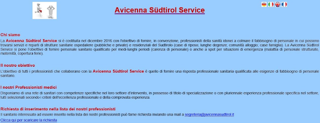 Pare che a Bolzano sia nata un’agenzia, la Avicenna Sudtirol Service di Livolsi Elena, che recluta medici in possesso di specializzazione o con pluriennale esperienza (quindi addio alla specializzazione) ai fini di un inserimento in una lista volta a proporre un’offerta rivolta al sistema sanitario locale ed ai privati/convenzionati che occorrono di tali servigi o almeno così pare che proponga il sito, giudicate voi.