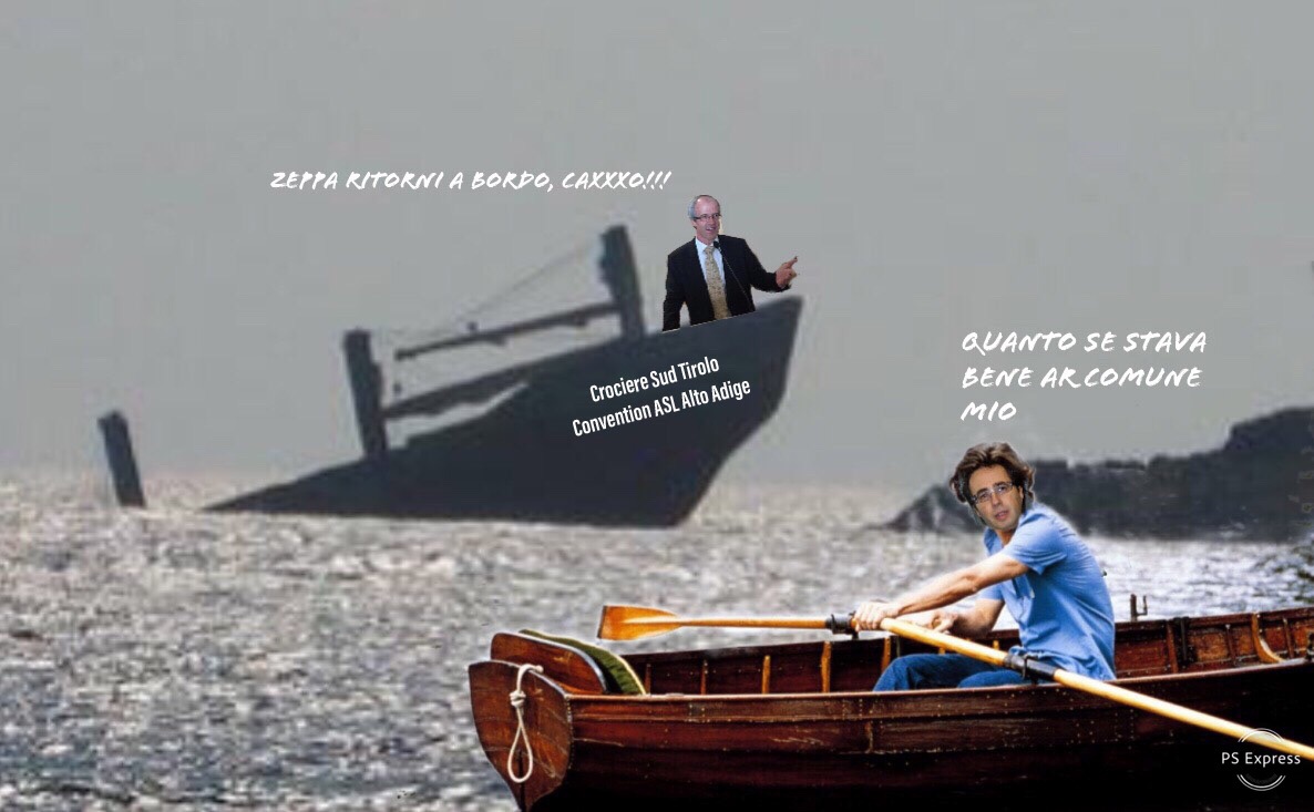 Come lo capii? Quando mi accorsi che l’uomo a bordo della scialuppa era nientepopodimeno che l’ex Direttore Amministrativo dell’ASL Alto Adige Andrea Zeppa, mentre il capitano della nave “morente” che sfuriava a rotta di collo su e giù per il ponte, altri non era che il Direttore Generale Florian Zerzer il quale, raccolte avidamente le ultime boccate d’aria, si lanciò in un ultimo accorato appello:
