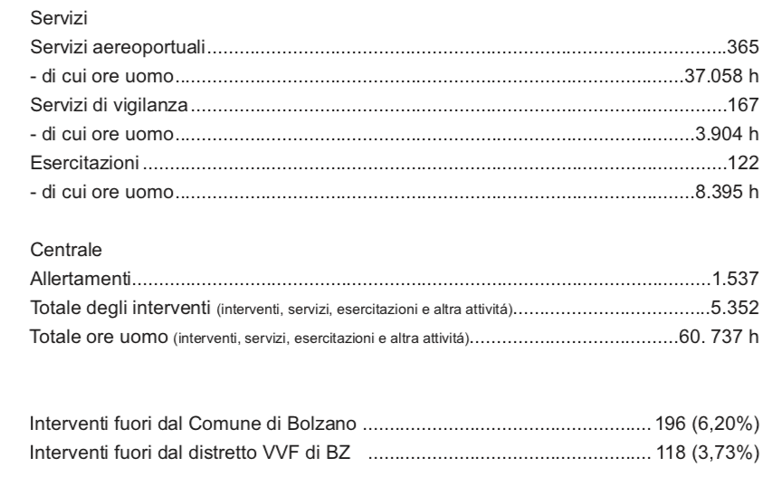 Anche quest’anno si é confermato il trend degli ultimi anni, che vede l’attivitá interventistica riguardante gli incendi in continuo calo: solo il 19% del totale ha riguardato infatti tale tipologia d’intervento (compresi gli allarmi dei rilevatori di fumo ed i falsi allarmi). Ció nonostante nel passato inverno, si sono registrate due vittime a causa di incendi in abitazioni private in Alto Adige.
