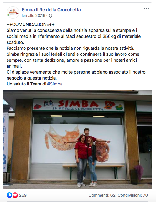 Ci dispiace veramente che molte persone abbiano associato il nostro negozio a questa notizia. Un saluto, il Team di #Simba“.