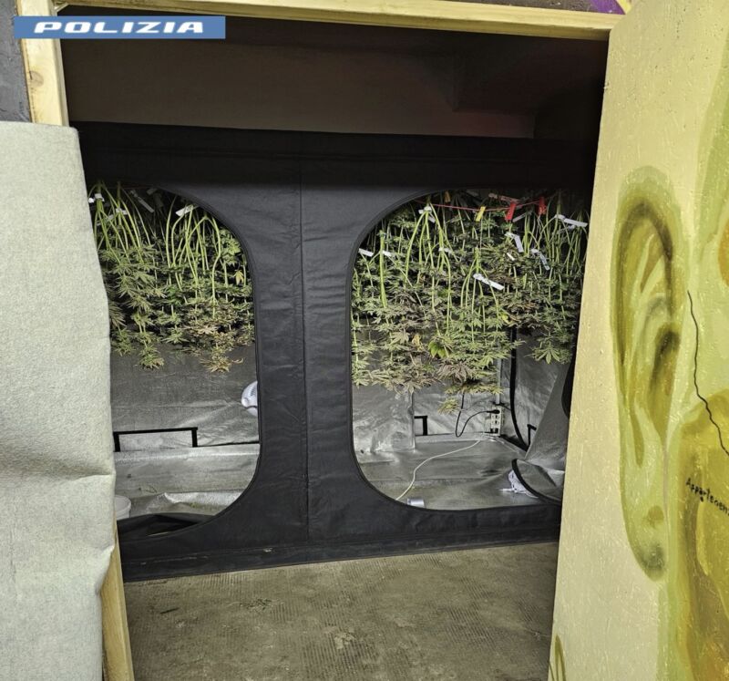 La perquisizione ha rivelato un box segreto nascosto da un pannello scorrevole in legno, all’interno del quale sono state trovate 71 piante di marijuana in fase di essiccazione. Il locale era attrezzato con lampade speciali, ventilatori, sistemi di irrigazione e filtraggio dell’aria, oltre a materiale per il confezionamento della droga e tre bilancini di precisione. Sono stati inoltre rinvenuti contenitori con marijuana e hashish in quantità ancora da definire.