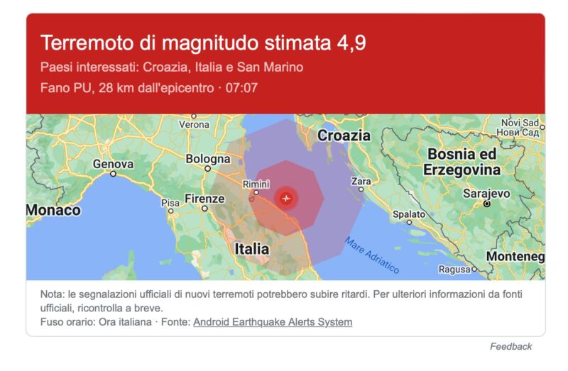 Per alcuni secondi i lampadari hanno cominciato a dondolare. L’epicentro della scossa è stato infatti individuato a 64 km a largo di Rimini e a 38 da Pesaro nel mar Adriatico alla profondità di 8 km. Il sisma è stato catalogato inizialmente di magniduto 6,1 della scala Richter poi corretto a 5,7.