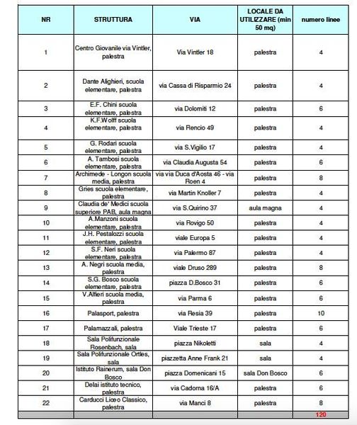 A Bolzano diverse strutture, in totale 22, sono già state individuate. Tra queste diverse palestre di istituti scolastici, sale polifunzionali. Messi a disposizione anche gli spazi di Palasport e Palamazzali.