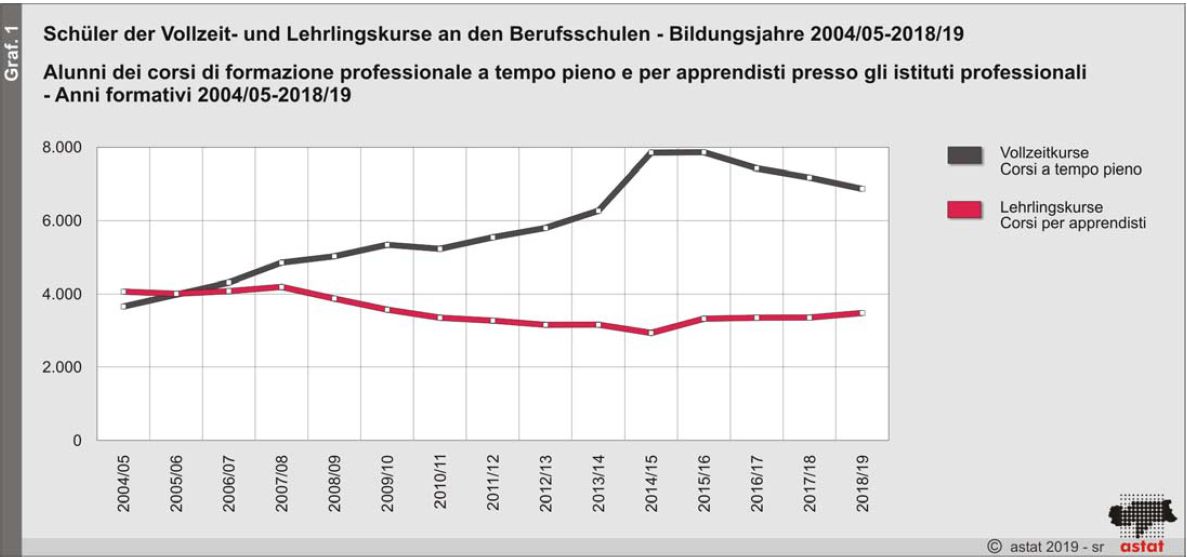 Nell’anno formativo 2018/2019 – rileva l’Astat – risultano 10.354 giovani iscritti agli istituti professionali, di cui 6.874 ai corsi a tempo pieno, questi ultimi in calo del 4,3%, terza flessione consecutiva. Gli apprendisti sono stati 3.480, in aumento del 3,8%, ma il numero ristagna da 10 anni.