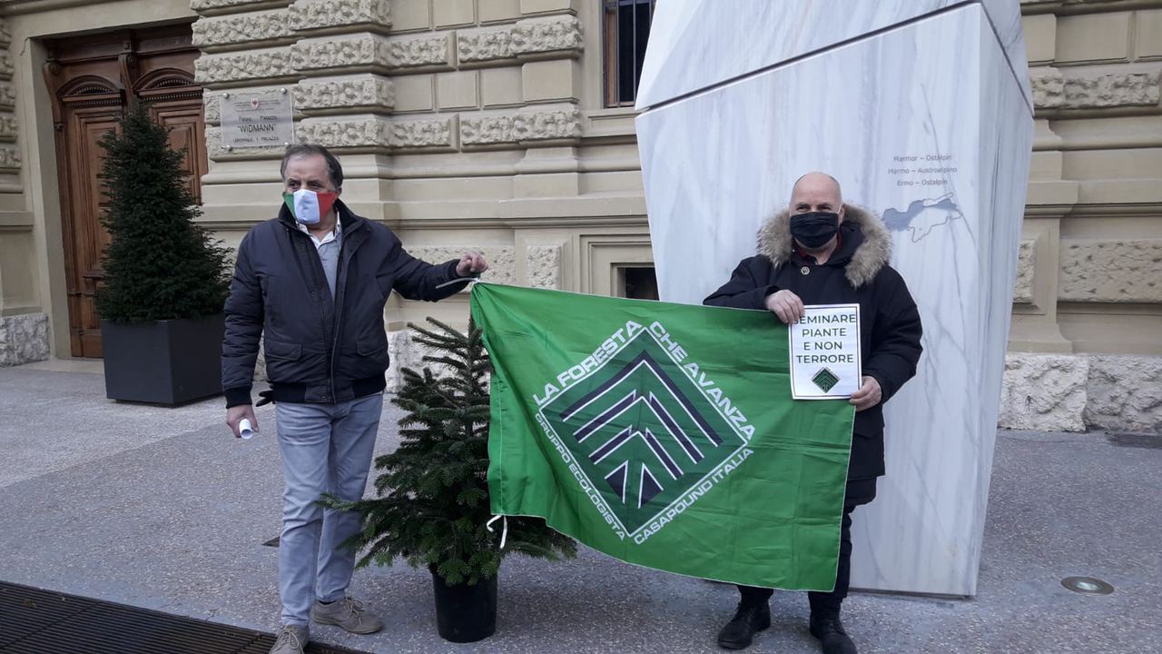 Piantati alberi a Trento e Riva del Garda. A Bolzano il gruppo ecologista ha donato un abete alla Provincia per essere piantato nelle zone disastrate dalla tempesta di due anni fa nella zona di Carezza.