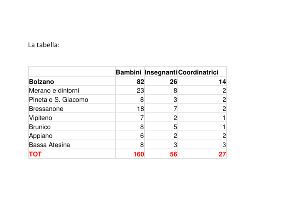 Parte entro mercoledì il servizio di emergenza anche nella scuola dell’infanzia italiana. Sono complessivamente 160 i bambini accolti, di questi 82 si trovano nel Comune di Bolzano, 23 a Merano e dintorni, 18 a Bressanone e 37 nei restanti comuni (in allegato la tabella con i dati completi).