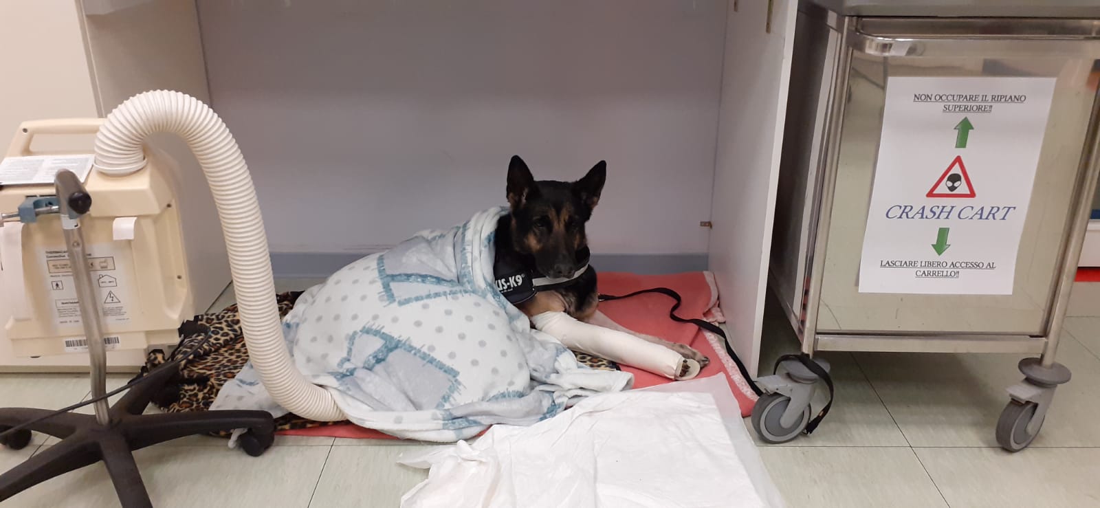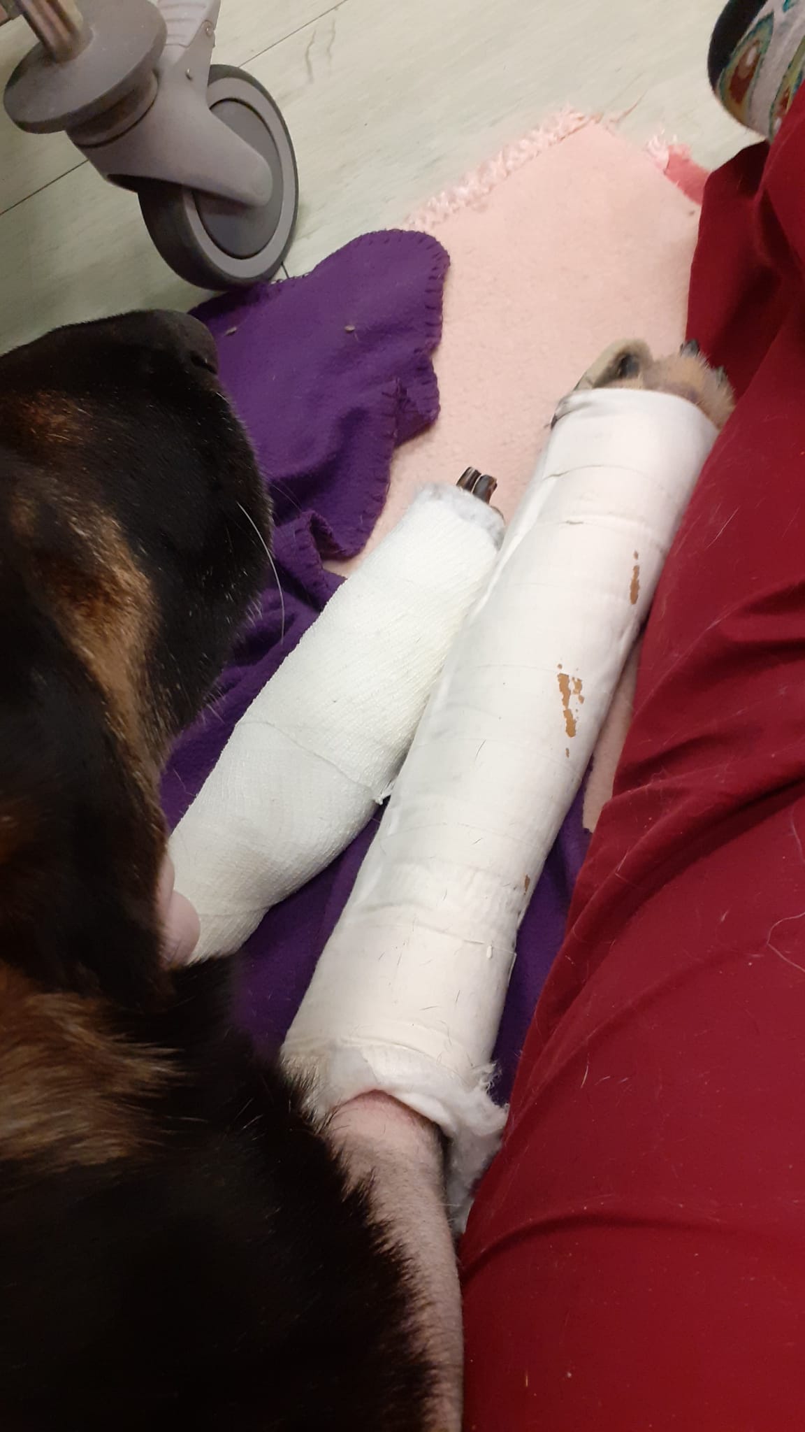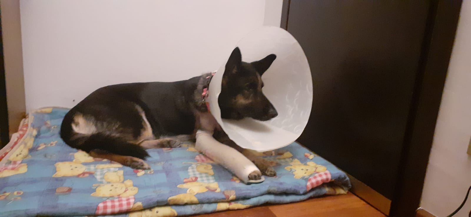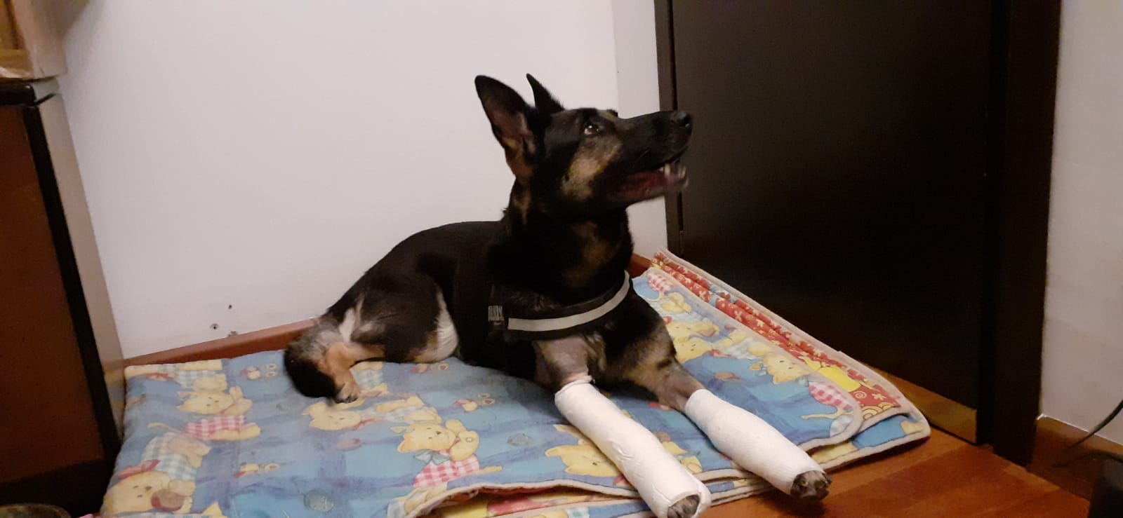 Dea viene stabilizzata in terapia intensiva e la diagnosi è sconfortante: lussazione della zampa, frattura del carpo e frattura di due dita alla zampa sinistra. Rottura di tutti i legamenti del carpo e frattura di un dito alla zampa destra. Condizioni che impongono costose ed impegnative cure veterinarie. Impossibile, con una simile diagnosi, pensare che Dea possa tornare a camminare o anche solo reggersi in piedi. Senza interventi non riesce neppure a sedersi.