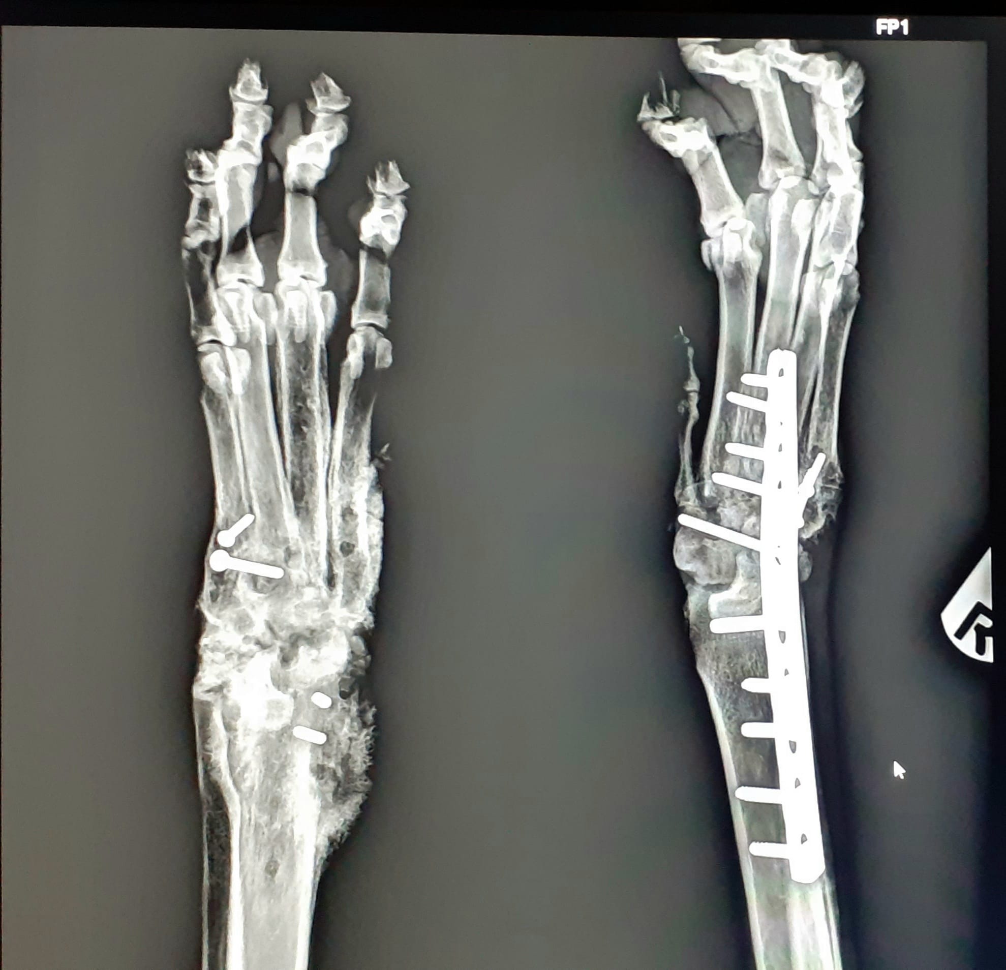 “Nelle ultime settimane abbiamo dovuto operarla altre due volte – racconta Nolli – . Il 29 marzo abbiamo eseguito una chirurgia ortopedica programmata ed urgente di artrodesi del carpo destro ed il 22 aprile per la rimozione della seconda placca.