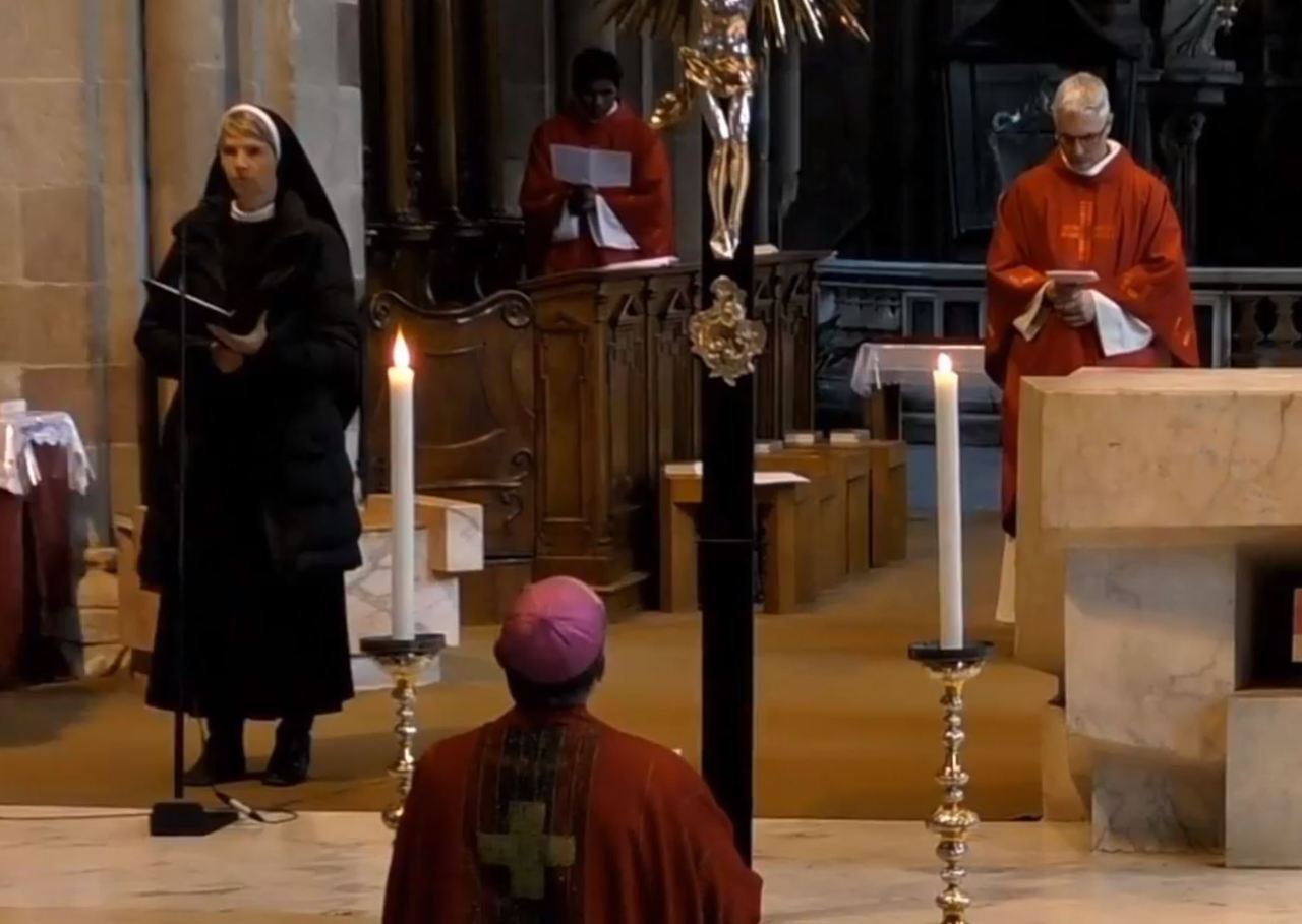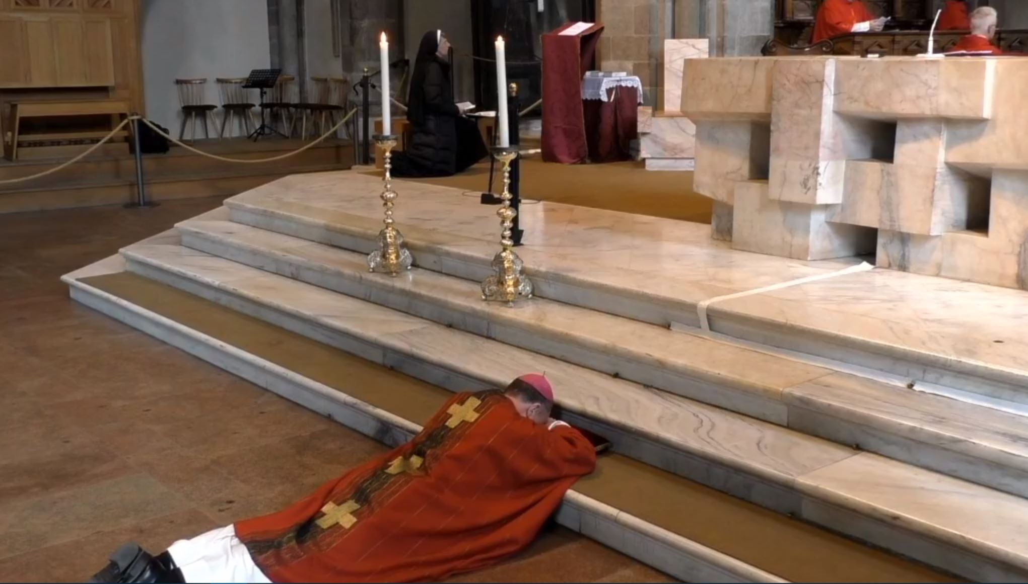 La liturgia del Venerdì Santo, giorno in cui la Chiesa ricorda la passione e la morte di Gesù, è iniziata alle 15, l’ora della morte di Cristo, con il vescovo Ivo Muser prostrato davanti all’altare e alla croce ed è proseguita con la lettura della Passione in un duomo deserto.