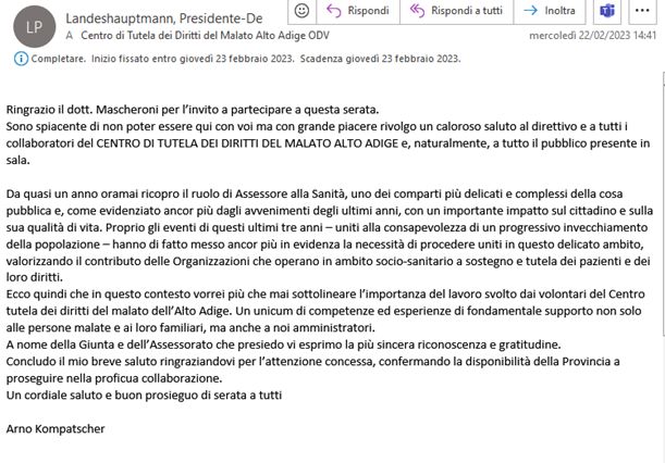Il Presidente Arno Kompatscher, Assessore alla Salute, non riuscendo a presenziare ha mandato una lettera che è stata letta all’inizio della serata.
