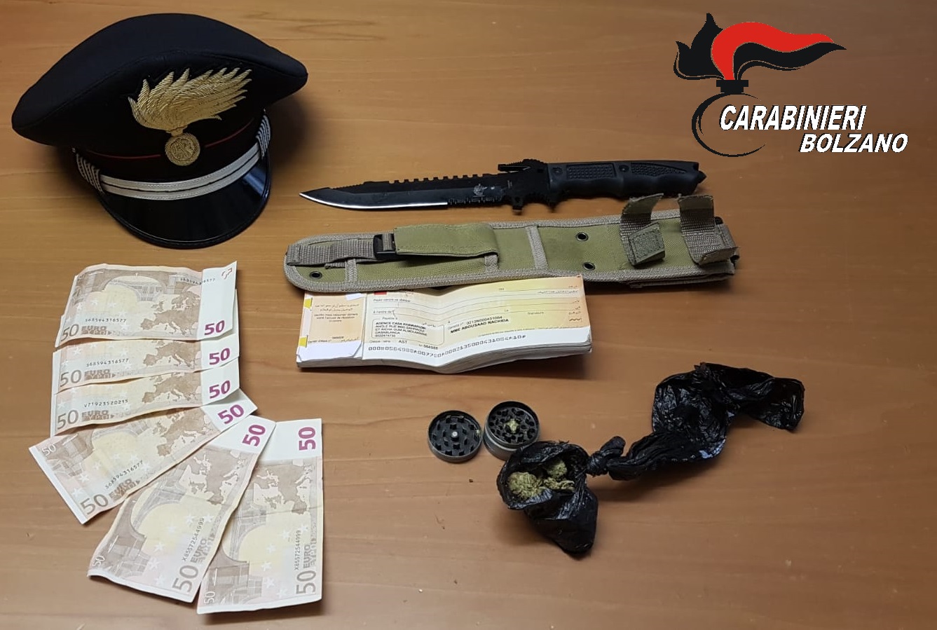 Dalla perquisizione anche domiciliare sono stati trovati in possesso di ulteriori banconote da cinquanta euro false, di circa dieci grammi di marijuana e di un coltello a doppia lama fissa modello “Combat Camillus”.