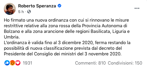 Sotto, la dichiarazione odierna (24 novembre) del ministro per la Salute, Roberto Speranza
