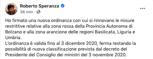 “Ho firmato una nuova ordinanza con cui si rinnovano le misure restrittive relative alla zona rossa della Provincia Autonoma di Bolzano e alla zona arancione delle regioni Basilicata, Liguria e Umbria. L’ordinanza è valida fino al 3 dicembre 2020, ferma restando la possibilità di nuova classificazione prevista dal decreto del Presidente del Consiglio dei ministri del 3 novembre 2020“, scrive lo stesso ministro sul suo profilo social.