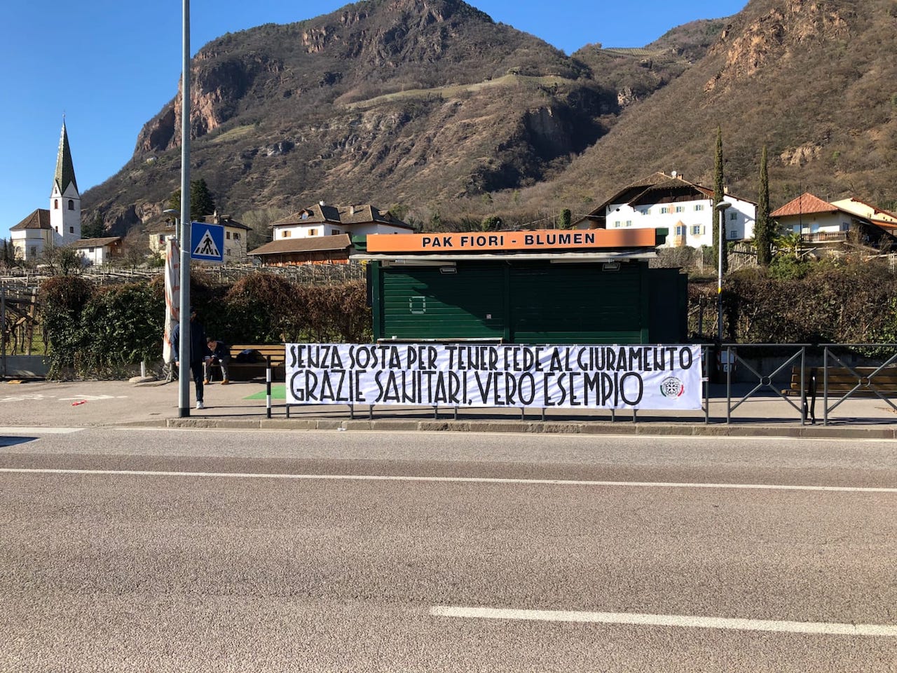 Striscione di CasaPound all’ospedale di Bolzano per ringraziare il personale sanitario