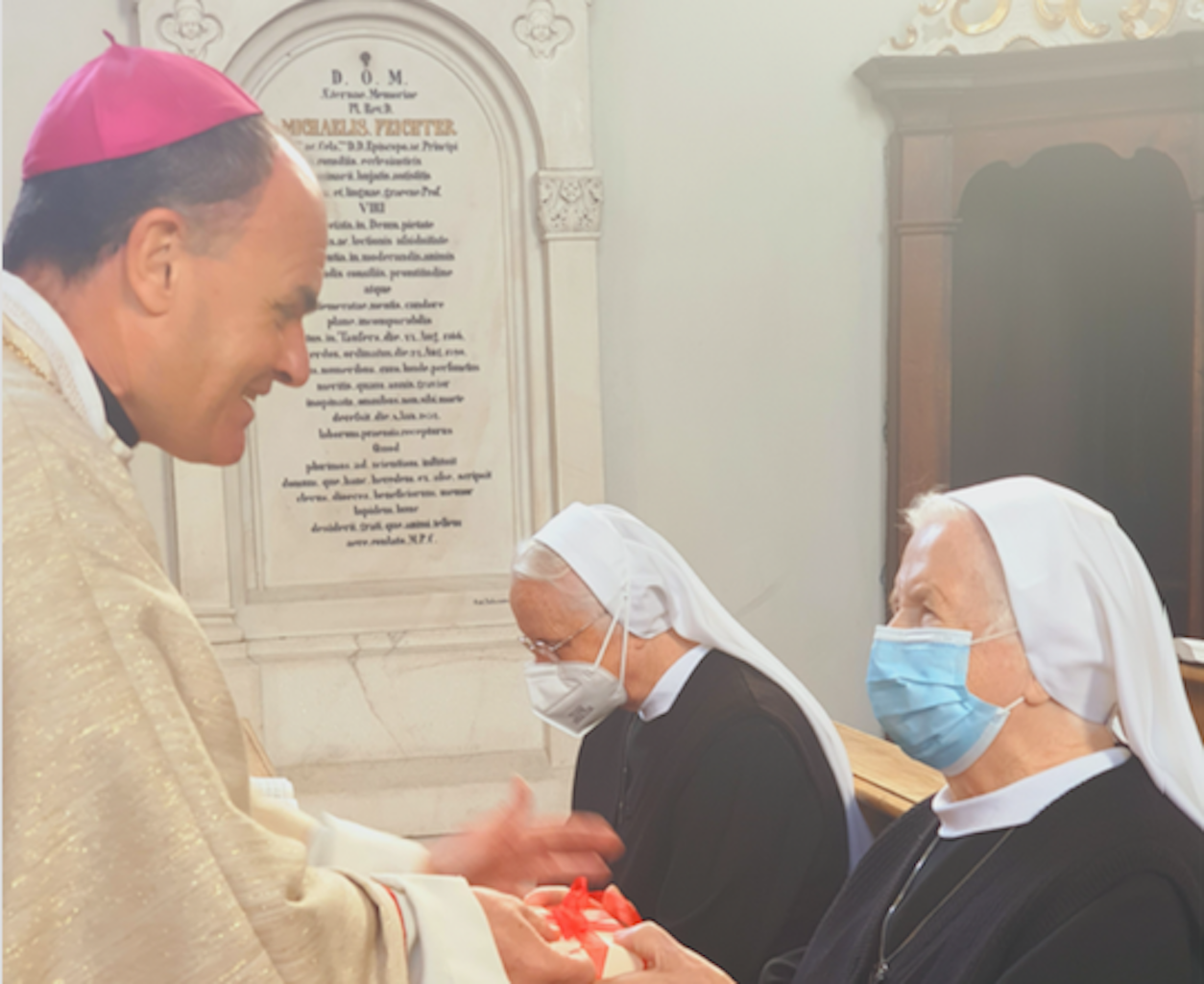 Il vescovo Ivo Muser ha partecipato oggi (9 aprile) a Bressanone al commiato delle due suore di Carità di San Vincenzo Maria Pietà Dorfmann e Ruth Maria Gogl dopo decenni di servizio nel Seminario maggiore. Suor Maria Pietà, la superiora, ha prestato servizio per ben 57 anni nella struttura.