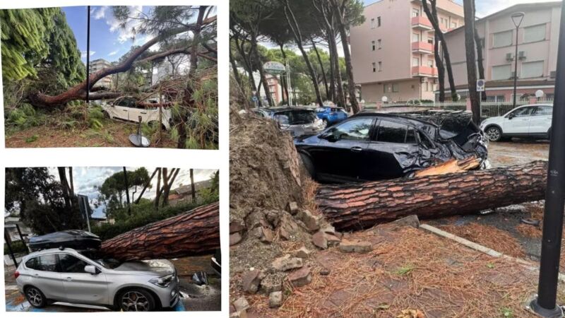 Il primo fronte temporalesco si è abbattuto intorno alle 4.30 su Ravenna e Cervia, per poi colpire con maggiore intensità la provincia di Rimini. Numerosi gli alberi crollati, allagamenti diffusi e danni ingenti a stabilimenti balneari e automobili. A Milano Marittima e Cervia, lettini ribaltati e coperture divelte raccontano l’intensità dell’evento atmosferico. La zona balneare è apparsa devastata già dalle prime luci del giorno.