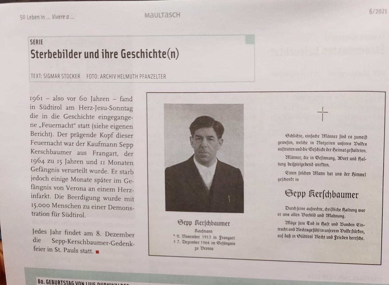 Nell’articolo, corredato dalla foto di una vecchia necrologia, si cita Kerschbaumer come “attore principale” (prägende kopf ) ricordando che ogni 8 dicembre a San Paolo si tiene una “cerimonia commemorativa” del noto terrorista.