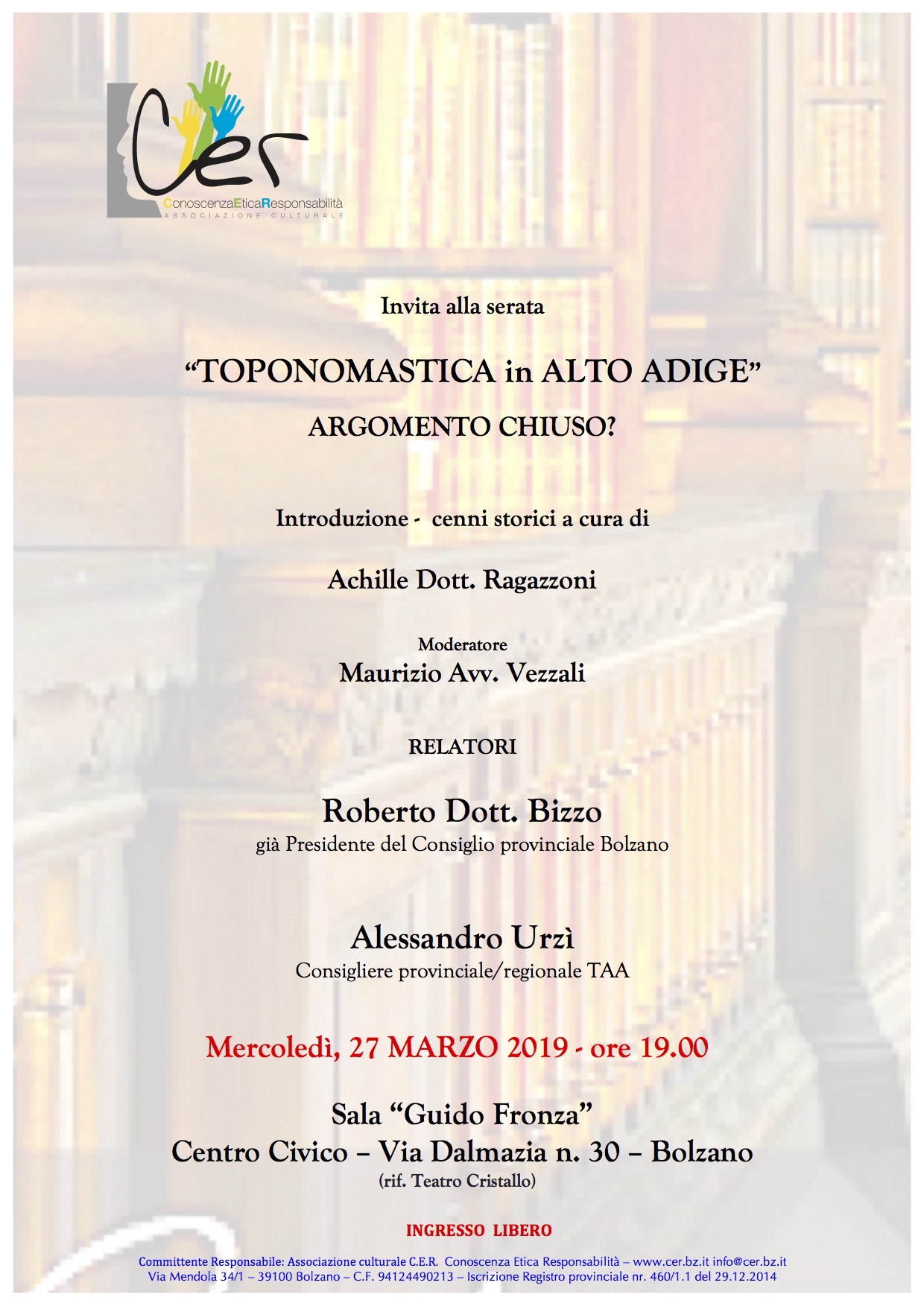 A questo proposito dice Urzì: “Abbiamo organizzato una conferenza-dibattito prevista per questa sera (27 marzo) alla sala Fronza di via Dalmazia. Nel corso dell’incontro organizzato dall’associazione Cer, si affronterà proprio l’argomento toponomastica con un confronto tra me e Roberto Bizzo, componente della Commissione dei Sei nella scorsa legislatura“.