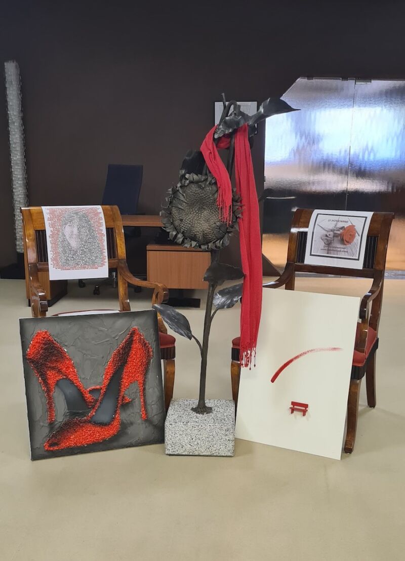 Al centro dell’installazione si trova “Il girasole spezzato”, un’opera d’arte in ferro battuto dell’artista Luciano Zanon. L’opera è coperta da un drappo rosso, una rappresentazione visiva del bollettino di guerra delle donne uccise nel 2023.