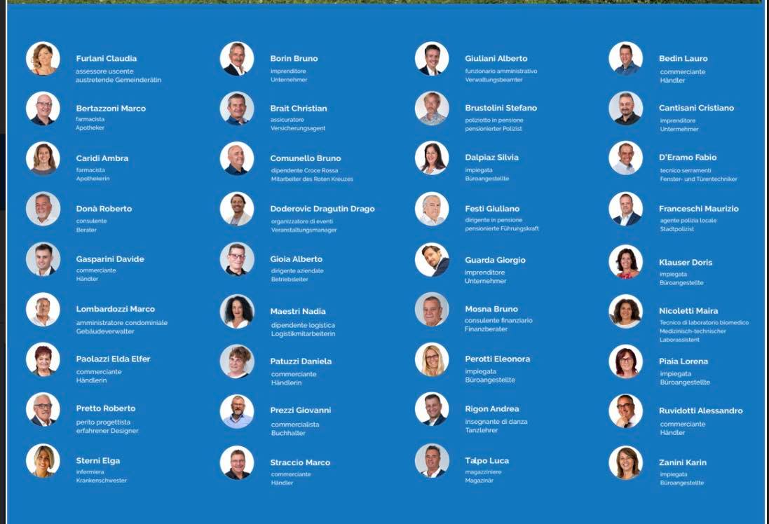 La compagine guidata da Bianchi comprende 36 persone, 12 donne e 24 uomini. Sono molto rappresentate anche le frazioni, con 12 candidati di San Giacomo, 4 di Pineta e gli altri 20 di Laives. Il più giovane ha 23 anni, il più maturo 73.