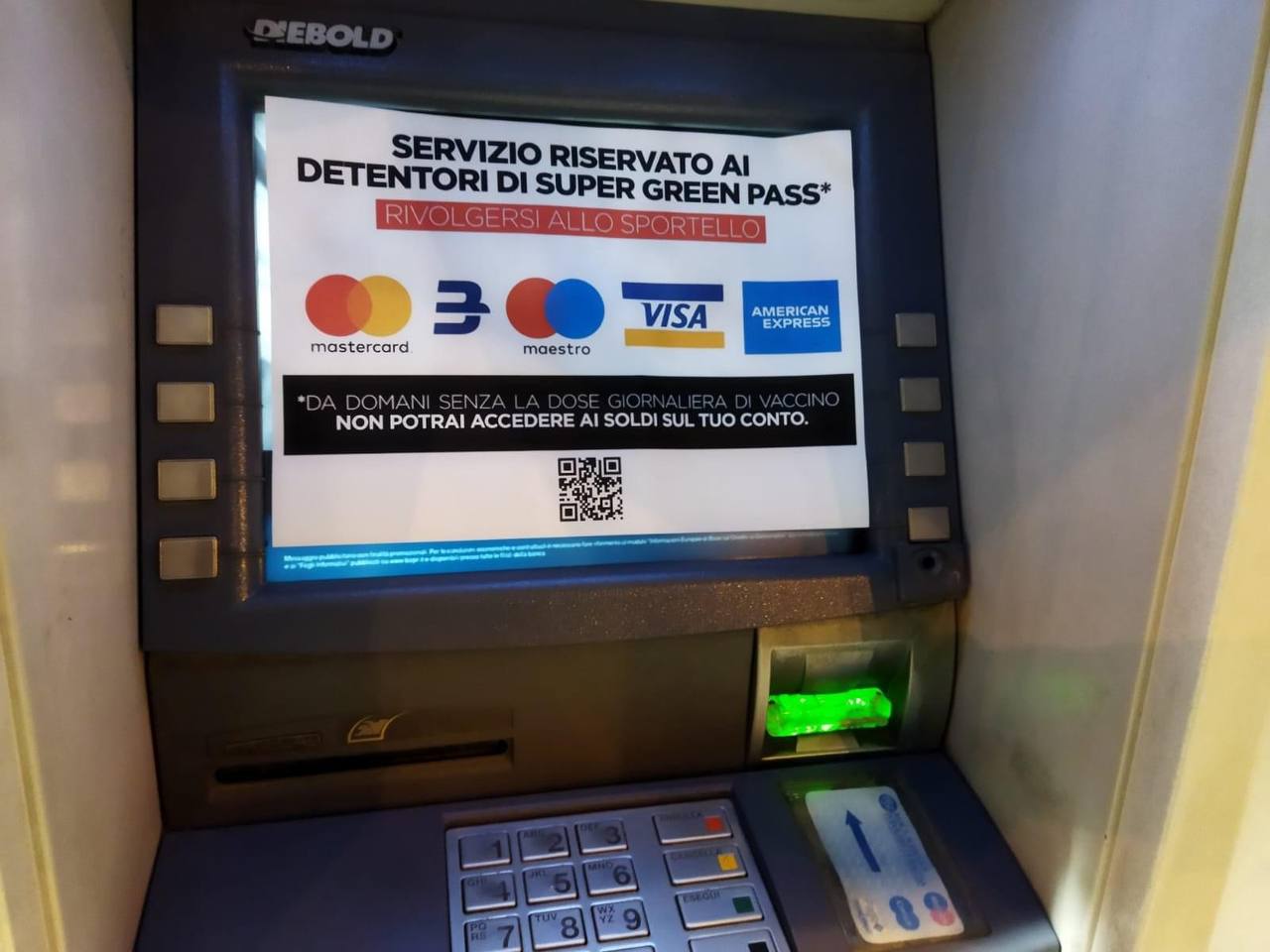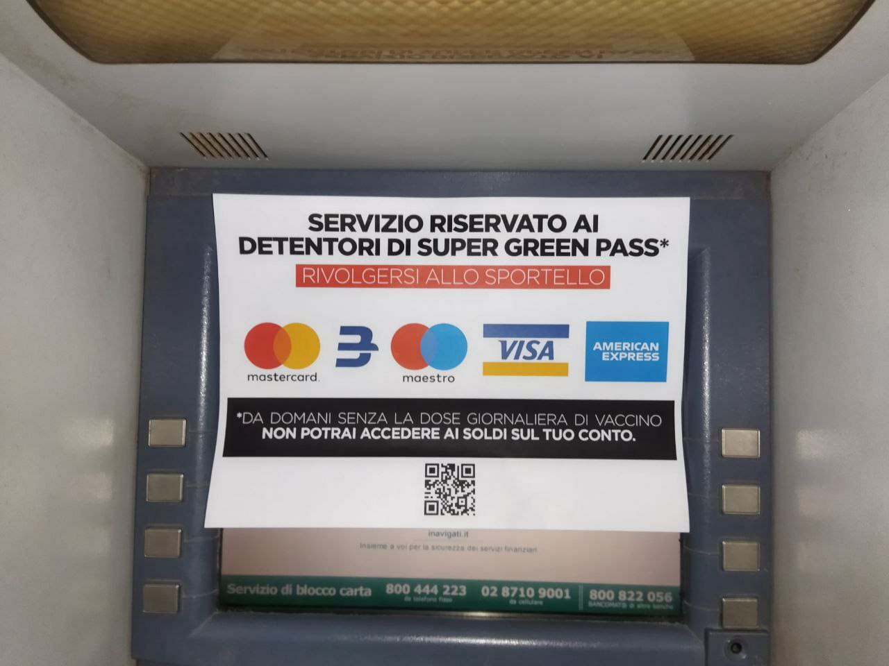 “Da domani senza la dose giornaliera di vaccino non potrai accedere ai soldi sul tuo conto“, questo il messaggio che recitano centinaia di adesivi e cartelli a firma CasaPound attaccati sui bancomat dei maggiori istituti di credito.