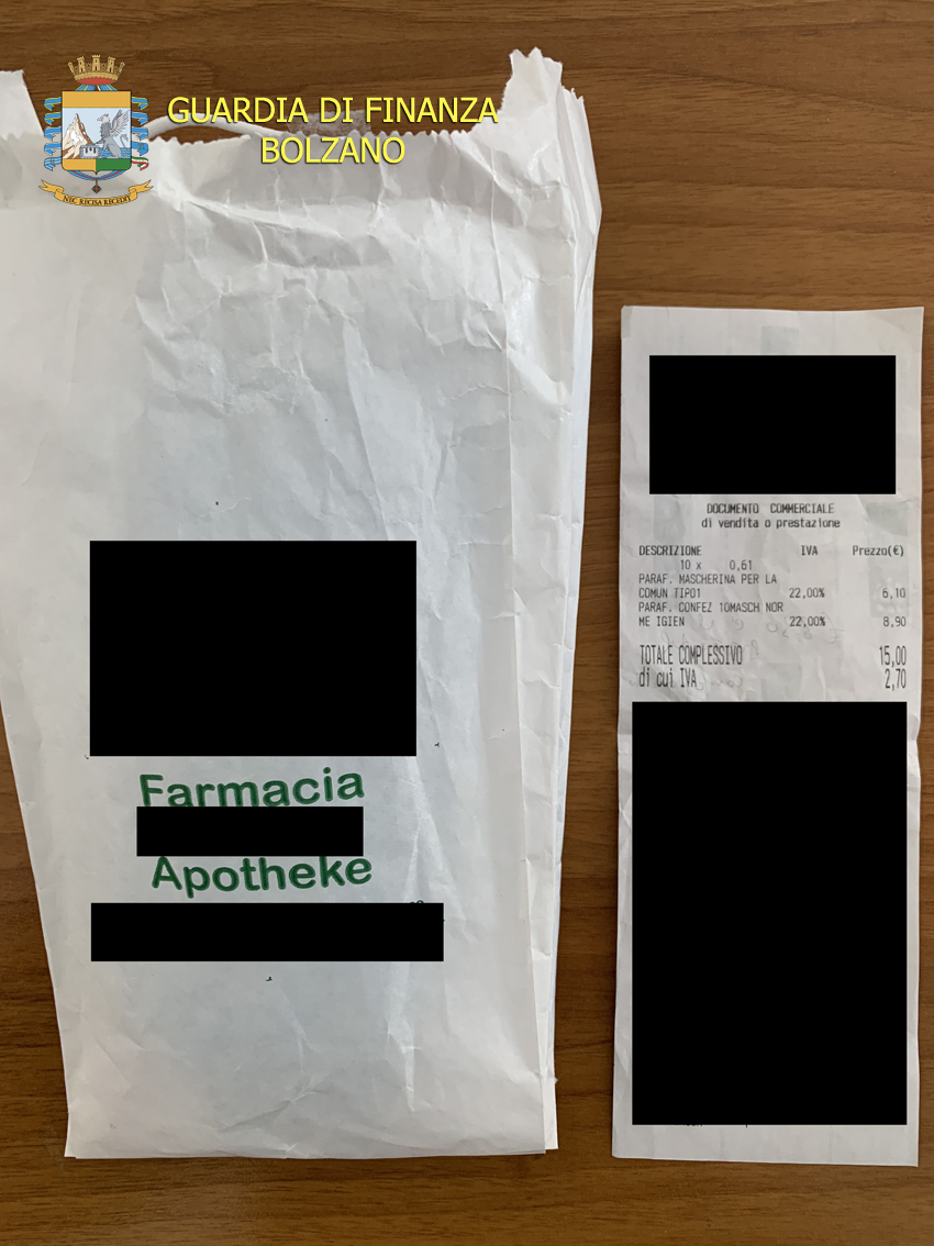 La Guardia di Finanza di Bolzano, nell’ambito di alcuni controlli ha denunciato a piede libero il titolare di due farmacie del capoluogo, per aver venduto mascherine chirurgiche al prezzo maggiorato, anziché a quello calmierato di 0,50 euro più I.V.A. (al 22%), ossia 0,61 euro.