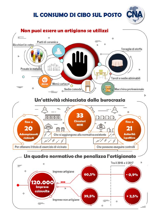 Il 74% dei Comuni non ha una regolamentazione organizza in tema di consumo sul posto, il 25% ha una regolamentazione ad hoc per gli artigiani. Per ottenere il titolo di esercizio di vicinato servono fino a 20 adempimenti. Il corso di somministrazione alimenti e bevande dura tra le 80 e le 140 ore. I titoli abilitativi per utilizzare gli spazi esterni variano da comune a comune.