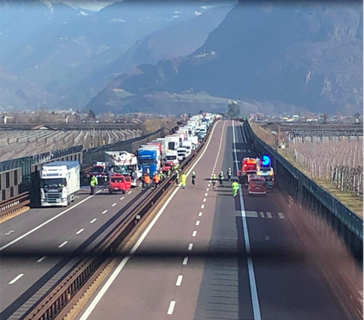 Pesante tamponamento tra due camion questa mattina intorno alle 9.30 in A22 tra due camion nel tratto che va da Bolzano Sud a Egna, in corsia Sud (km 92.500).