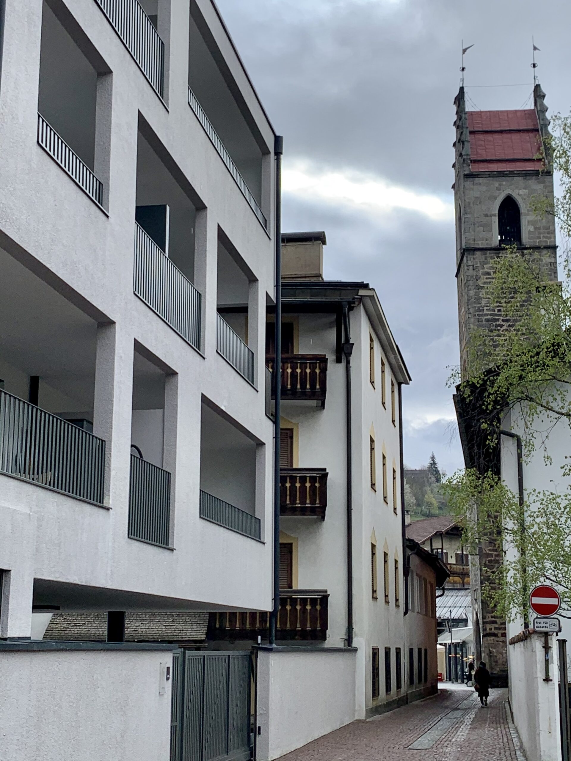 “Passeggiando nel centro storico di Vipiteno, può capitare d’imbattersi in edifici appena ultimati che stonano in modo evidente con il contesto limitrofo. Le nuove costruzioni che appaiono concepite nel rispetto di un unico valore, quello dell’efficienza energetica, s’intromettono con tutta la loro austerità, in quella naturale armonia paesaggistica, colorata e calda dei balconi in legno e dei tetti spioventi. Addirittura, in pieno centro storico, a pochi passi dalla Torre delle Dodici, è stato da poco ultimato un nuovissimo residence, certamente di ottima fattura ma concepito in evidente discontinuità con il paesaggio circostante“.